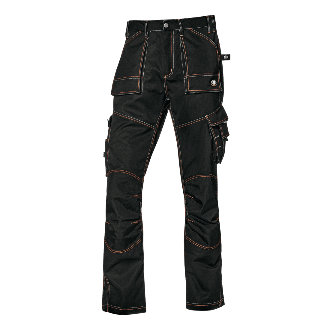 Munkavédelmi nadrág 65% poliészter és 35% pamutból készült strapabíró anyagból, Teflon kezeléssel, 310 g/m². Gomb és cipzár záródás, háromdimenziós első zsebek, tépőzáras farzsebek, oldalsó szerszámtartó csatos fülek, mérőszalag és snitzer tartó zsebek állítható kalapácstartóval a jobb lábszáron, háromdimenziós szerszámzseb a bal lábszáron telefonzsebbel és rejtett belépőkártya tartóval. Dupla varrással a tartósságért.