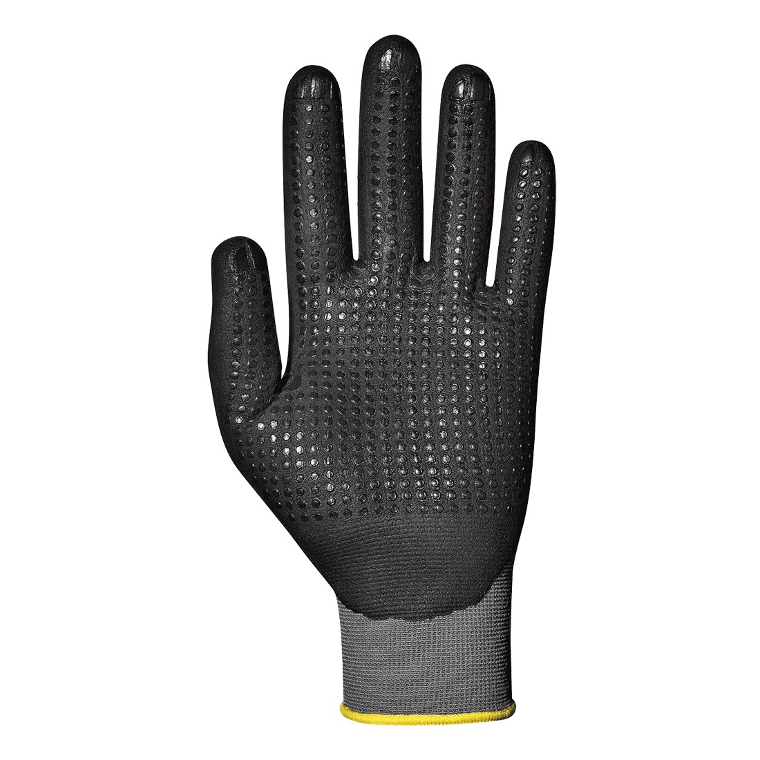 Nejlonból készült, nitril-poliuretán hab borítású, pikkelyes tenyerű kesztyű, rugalmas csuklórésszel.