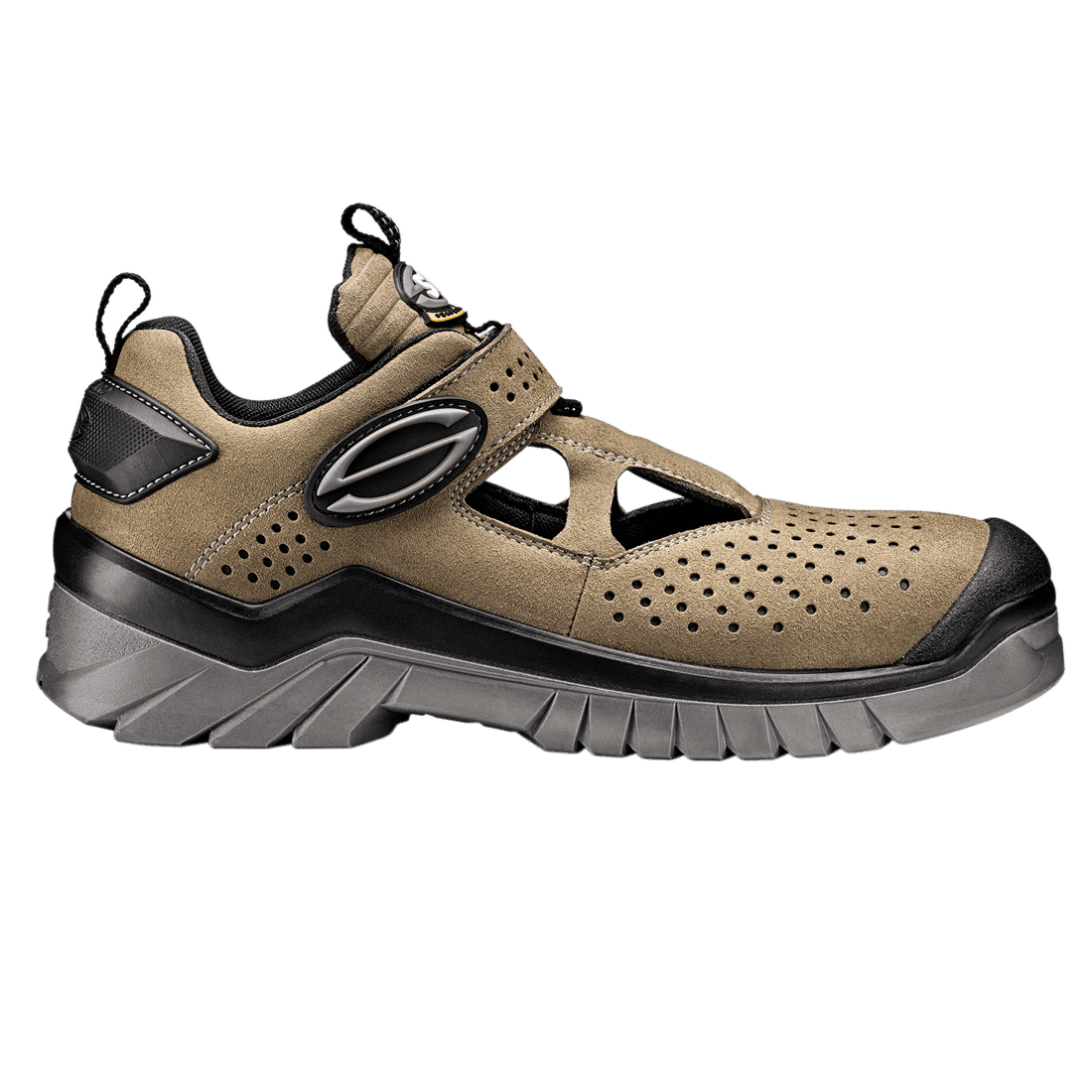 Tépőzáras szandál, acél lábujjvédelem (200 J) és acél talpátszúrás elleni védelem; szarvasbőr felső rész.