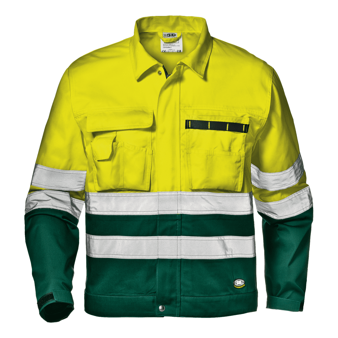 Láthatósági kabát 55% pamutból és 45% poliészterből (240 g/m²); ingnyakkal; rejtett cipzárral (patentos fedés); fedett, tépőzáras mellzsebbel; fényvisszaverő csíkkal a mellkason és az ujjakon; tépőzáras, állítható mandzsetta.