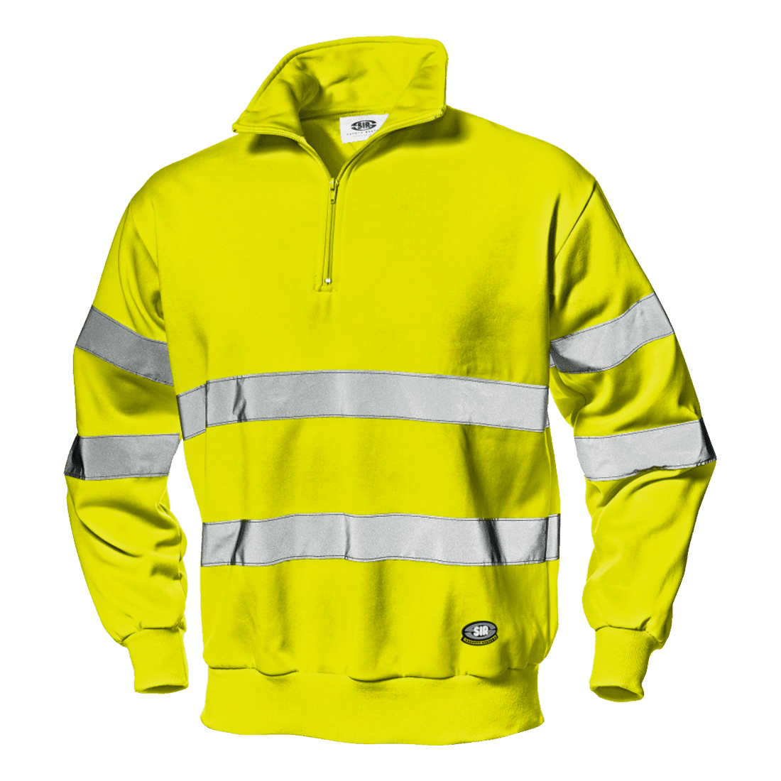 Láthatósági pulóver 55% pamutból és 45% poliészterből (320 g/m²), magasított nyakkal, cipzárral, rugalmas mandzsettákkal és derékrésszel, fényvisszaverő csíkkal a mellkason és az ujjakon.