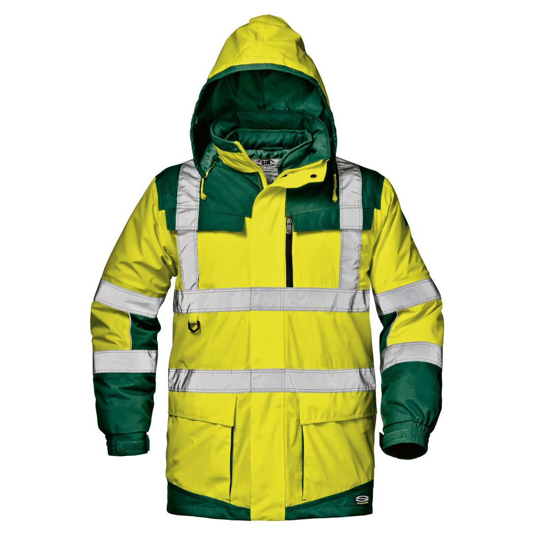 Négy az egyben láthatósági , béléses kabát, három rétegű, 100% poliészter Clipper-Tex lélegző, vízálló anyagból.
