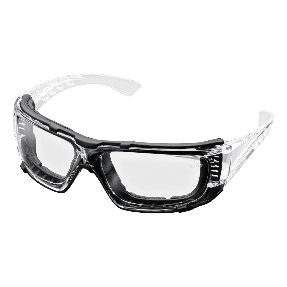 Teljes mértékben polikarbonátból készült védőszemüveg; szivacsos betéttel, mely csökkenti az ütődés mértékét, és véd a finom részecskék és fröccsenő cseppek ellen.