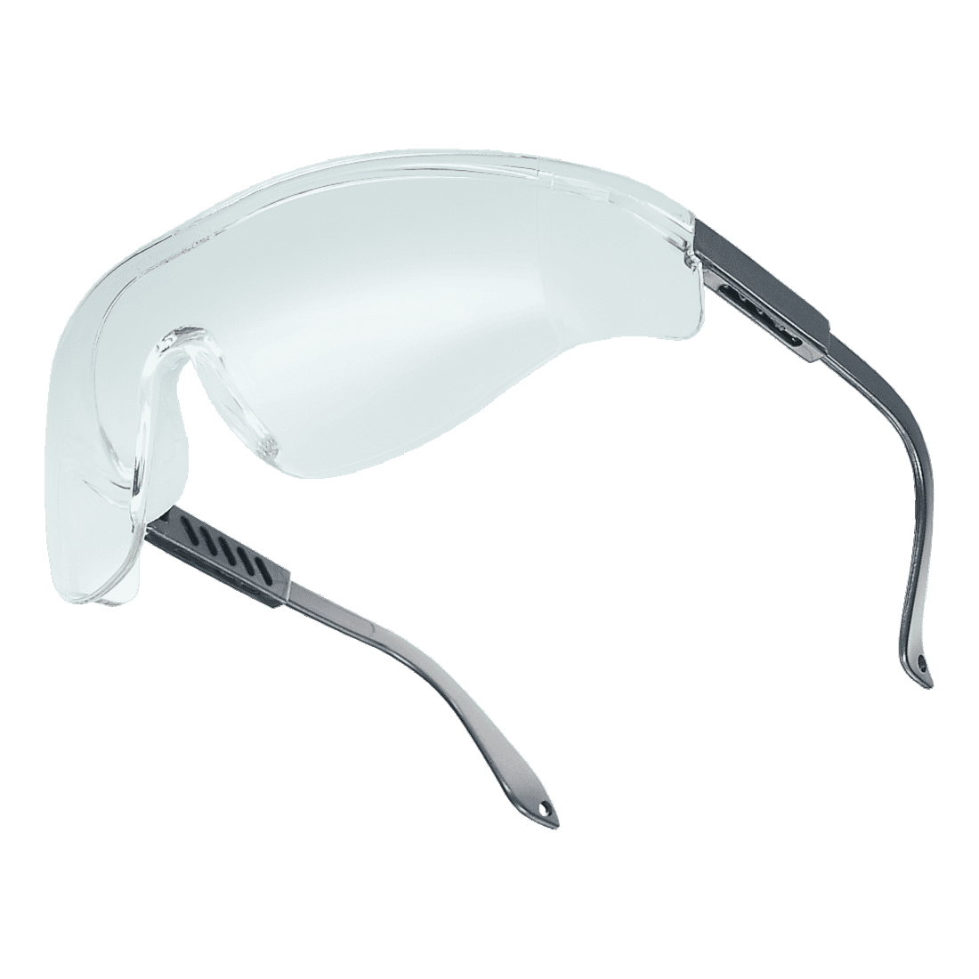Mono lencsés védőszemüveg; állítható hosszúságú, billenthető szárakkal. A konvex lencsék hozzájárulnak a párásodás mentességhez.