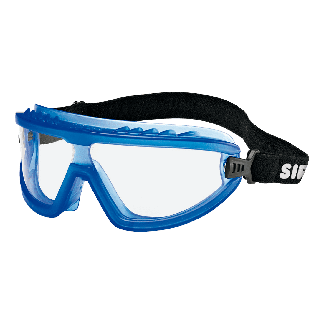 Puha PVC-ből készült védőszemüveg széles, állítható, rugalmas fejpánttal, archoz illeszkedő belső résszel.