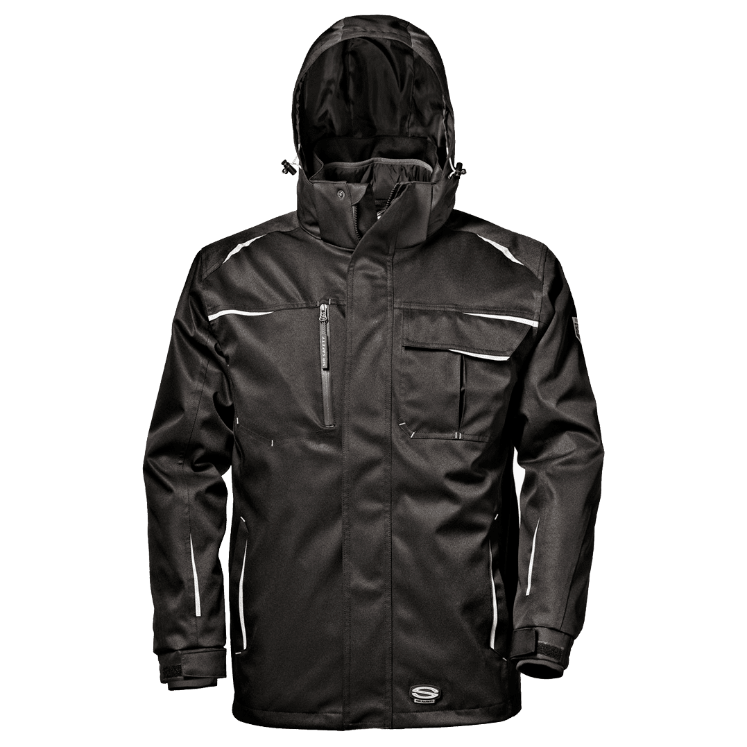 Három az egyben modell, lecipzározható belső dzsekivel. Hőszigetelt varrásokkal; rejtett cipzárral és patentokkal történő záródás. Összehajtható kapucni. Cipzáras, vízálló mellzsebek. Tépőzárral állítható, rugalmas ujjvégek.