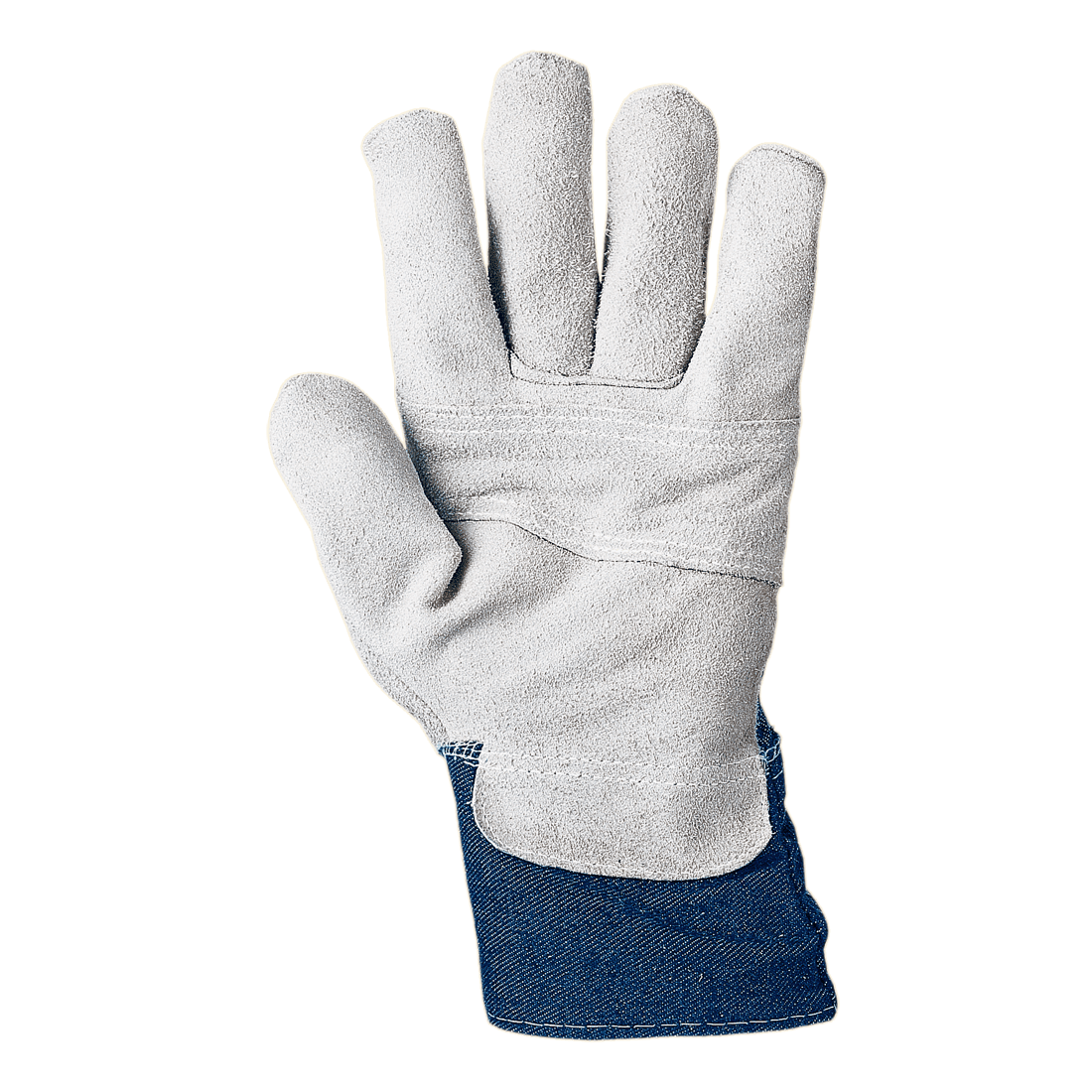 Hasított bőr kesztyű, farmer anyagú kézháttal, merev farmer anyagú csuklórésszel.
