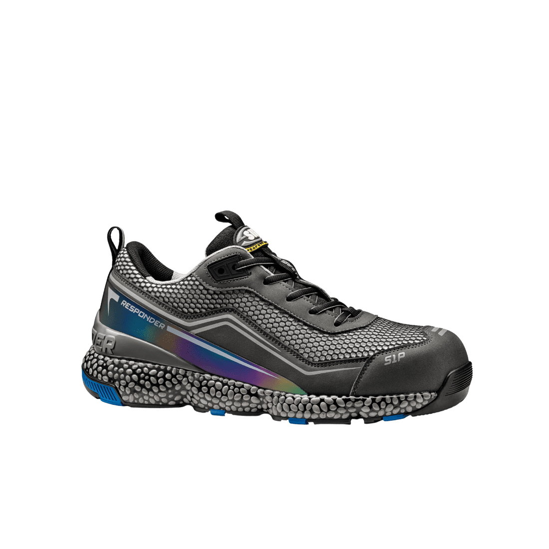 Munkavédelmi cipő ultra-dinamikus dizájnnal, alumínium lábujjvédelemmel, és 4 mm vastag, kompozit talpátszúrás ellen védelemmel. Air-Mesh/Microfiber felső rész fűzővel és fényvisszaverő betétekkel. Az E-TPU Responder/gumi külső talp kiváló rugalmasságot és párnázott hatást biztosít. A külső talp, köszönhetően a keresztirányú, mély barázdáknak, kiemeli a talp rugalmasságát, és kiváló tapadást biztosít minden felületen (SRC).