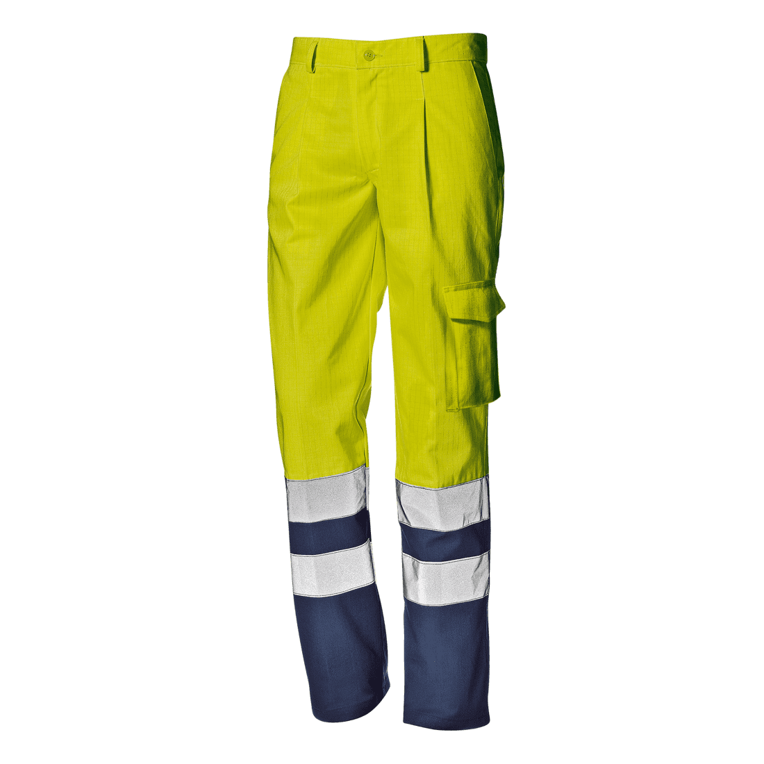 Gombos derekas nadrág; ferde zsebek; tépőzáras, fedett farzsebek; dupla fényvisszaverő csíkok a lábszárakon.
