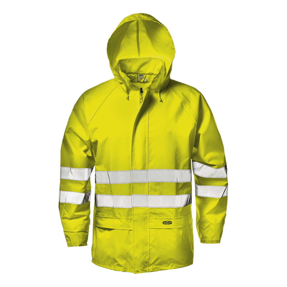 Láthatósági kabát rejtett cipzárral és gombokkal; feltekerhető kapucnival; rugalmas, szélálló mandzsettákkal; gombokkal záródó, vízálló zsebekkel; szellőző nyílások a vállakon; fényvisszaverő csíkok a mellkason.