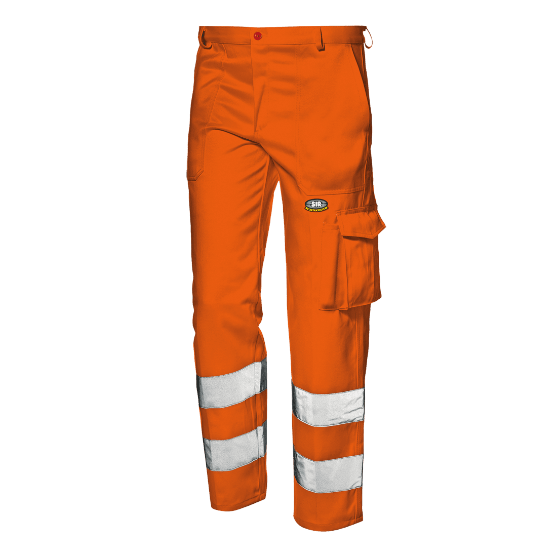 Láthatósági nadrág 60% pamutból és 40% poliészterből (350 g/m²). Gombos és cipzáras; két darab ferde zseb; háromdimenziós, fedett, tépőzáras oldalzseb, tollzsebbel. Jobb lábszáron mérőszalag tartó zseb. Fedett, gombos farzseb.