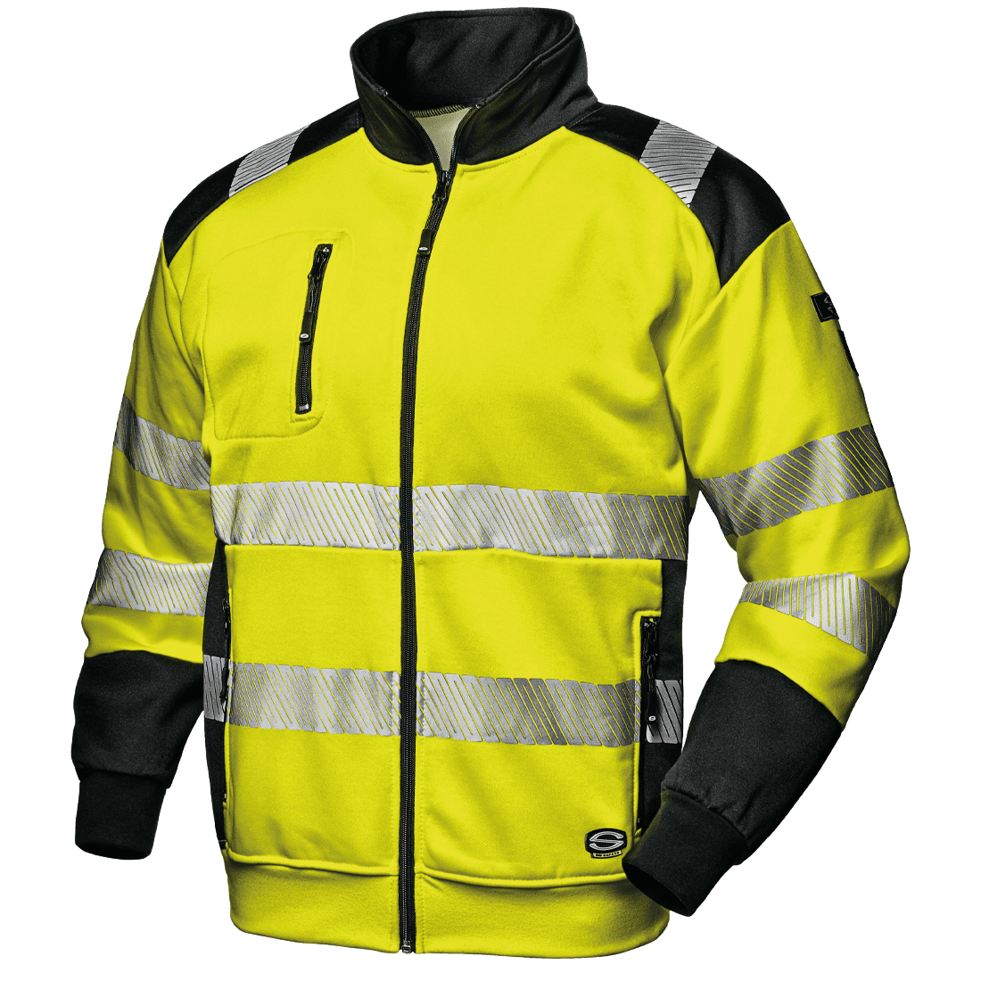 Láthatósági pulóver 65% pamutból és 35% poliészterből (320 g/m²), magasított nyakkal, cipzárral, rugalmas mandzsettákkal és derékrésszel, fényvisszaverő csíkkal a mellkason és az ujjakon, cipzáras külső mellzsebbel.