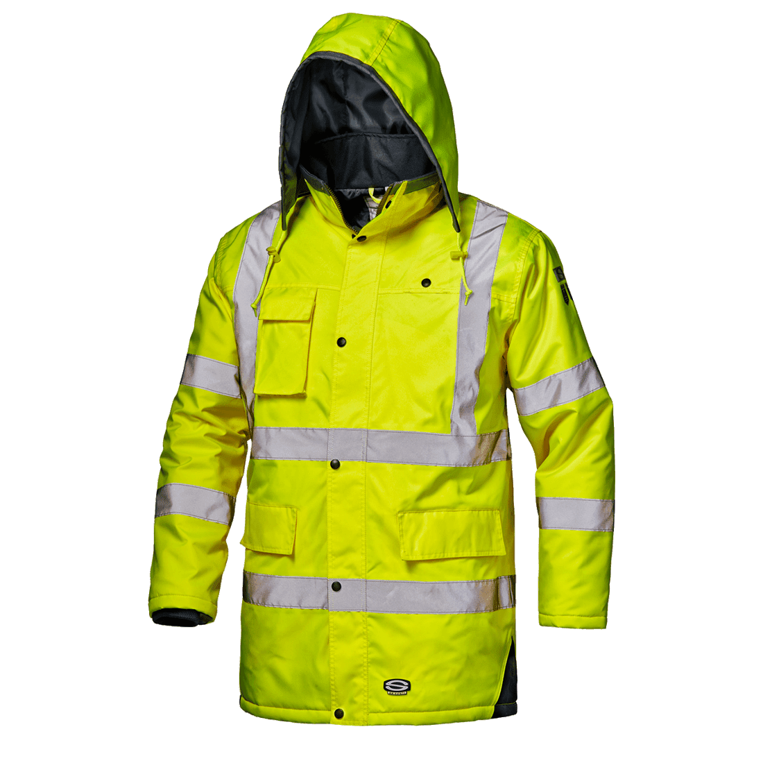 Láthatósági kabát 100% poliuretánnal borított poliészterből, 200 g/m²-es, vízálló béléssel.